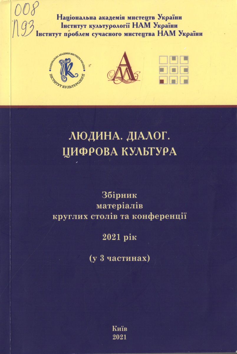 Людина. Діалог. Цифрова культура : зб. матеріалів кругл. столів та конф., 2021 р. : (у 3 ч.) / Нац. акад. мистецтв України, Ін-т культурології НАМ України, Ін-т пробл. сучас. мистецтва НАМ України ; упоряд.: І. Б. Зубавіна, І. В. Кузнєцова ; наук.-редкол.: Г. П. Чміль, В. Д. Сидоренко [та ін.]. – К. : ІК НАМ України, 2021. – 384 с. : іл.