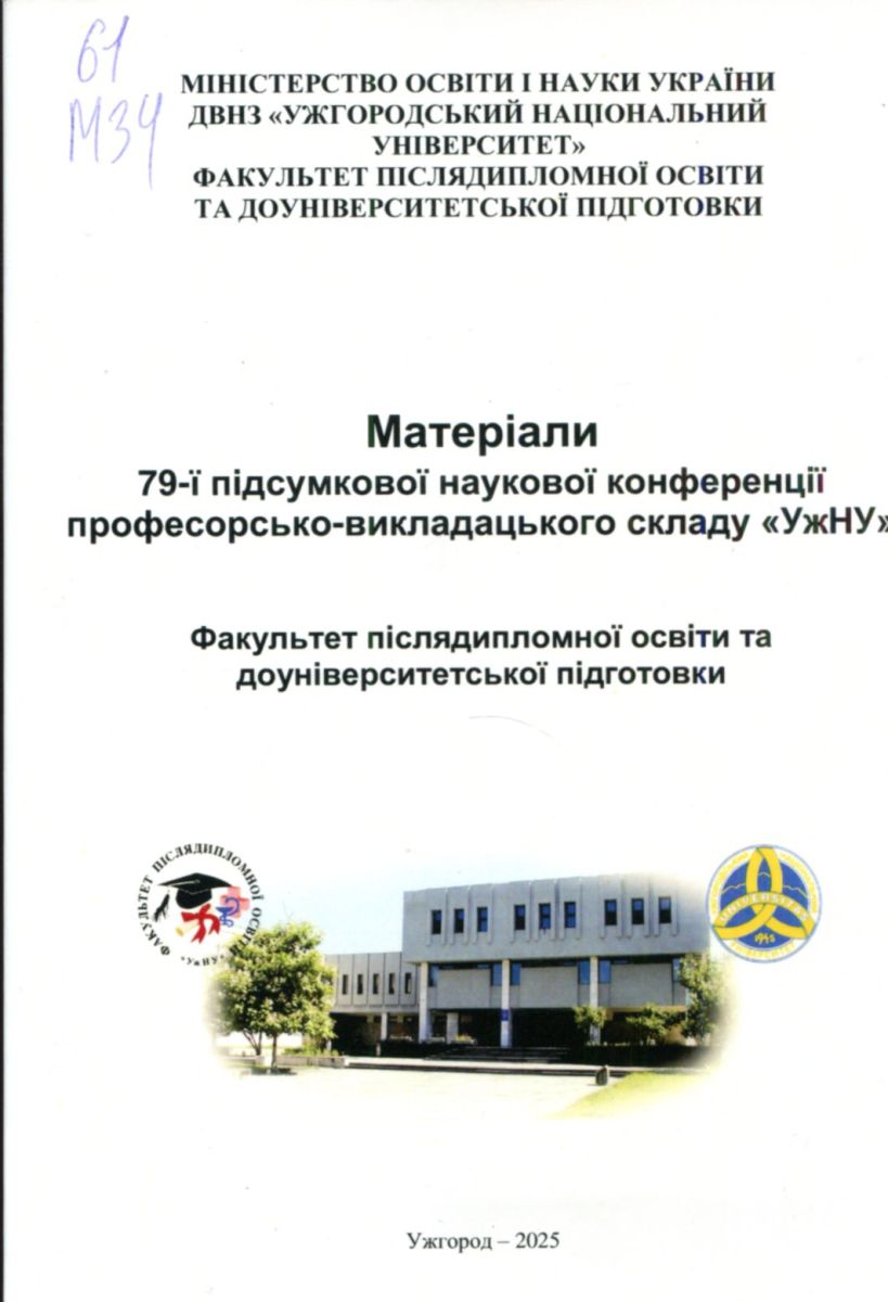 Матеріали 79-ї підсумкової наукової конференції професорсько-викладацького складу «УжНУ». Факультет післядипломної освіти та доуніверситетської підготовки : (Ужгород, 26 лют. 2025 р.) : [збірник] / М-во освіти і науки України, ДВНЗ «Ужгород. нац. ун-т», Ф-т післядиплом. освіти та доунів. підгот. ; голова редкол. І. В. Чопей ; редкол. Я. О. Михалко [та ін.]. - Ужгород : ФОП Сабов А. М., 2025. – 94 с. : іл., табл.