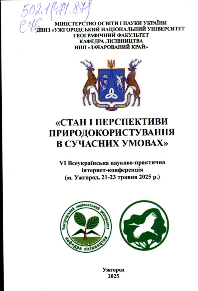 Стан і перспективи природокористування в сучасних умовах : 6 Всеукр. наук.-практ. інтернет-конф. (м. Ужгород, 21-23 трав. 2025 р.) / М-во освіти і науки України, ДВНЗ «Ужгород. нац. ун-т» [та ін.] ; редкол. Л. А. Потіш [та ін.]. – Ужгород : Говерла, 2025. – 80 с. : іл., табл. – Бібліогр. наприкінці ст.