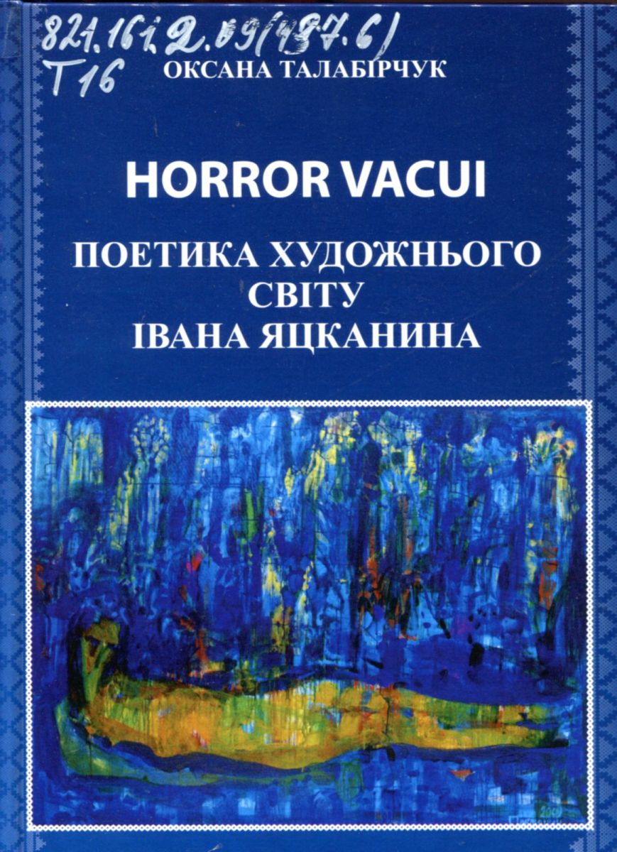 Horror vacui: Поетика художнього світу Івана Яцканина : монографія / О. Ю. Талабірчук. – Ужгород : ТІМРАNІ, 2019. – 160 с. – Бібліогр.: с. 145-157.