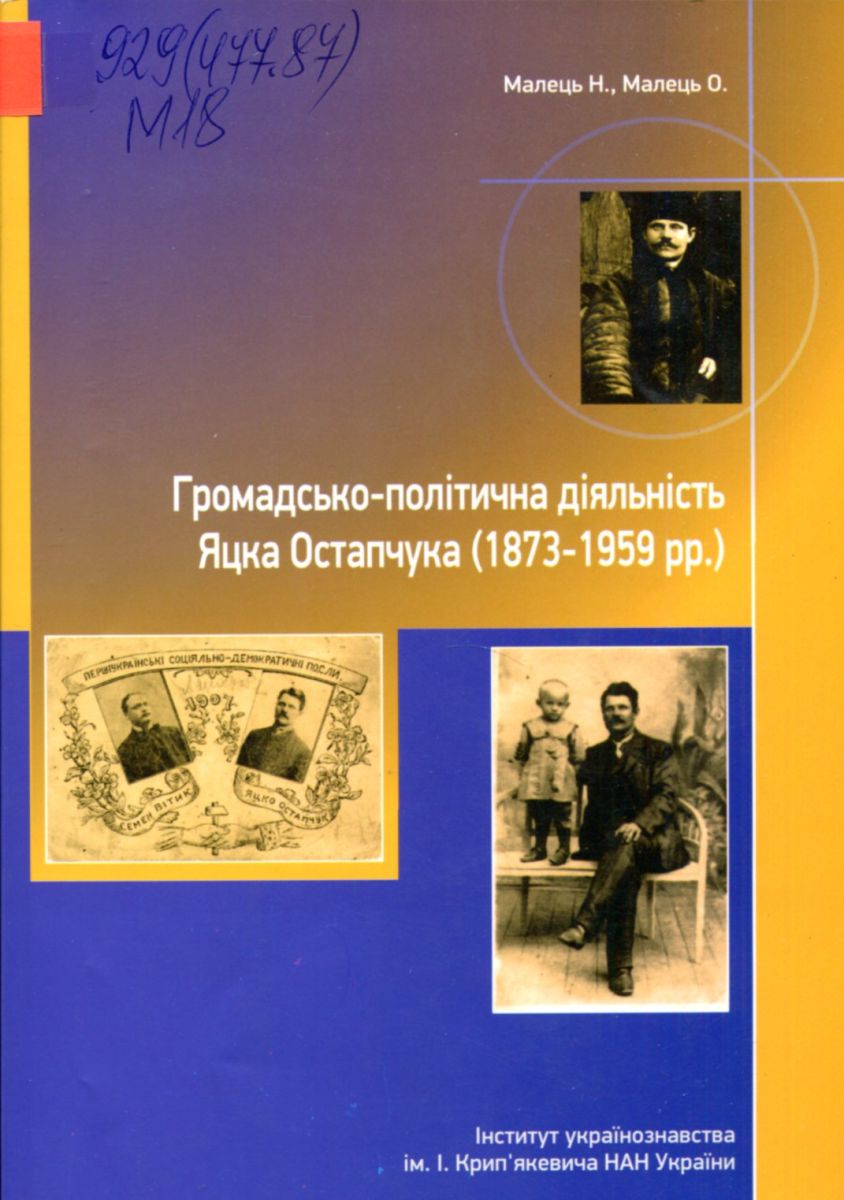 Громадсько-політична діяльність Яцка Остапчука (1873-1959 рр.) : [монографія] / Н. Б. Малець, О. О. Малець ; Ін-т українознавства ім. І. Крип’якевича НАН України. – Мукачево : Карпат. Вежа, 2015. – 150 с. : іл. – Бібліогр.: с. 129-147.