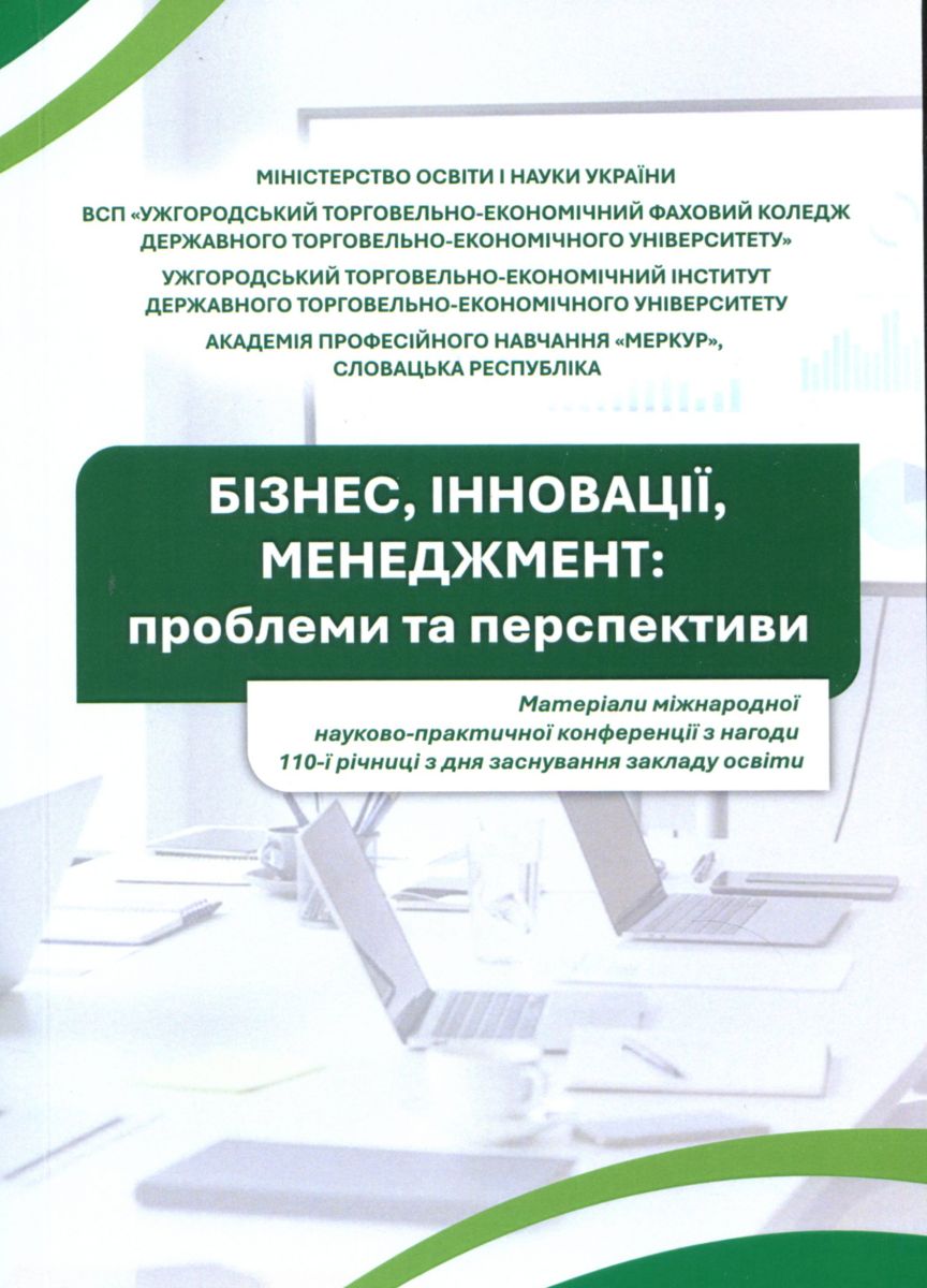 Бізнес, інновації, менеджмент: проблеми та перспективи : матеріали міжнар. наук.-практ. конф. з нагоди 110-ї річниці з дня заснування закладу освіти (29 трав. 2025 р., м. Ужгород) / М-во освіти і науки України, ВСП «Ужгород. торг.-екон. фах. коледж держ. торг.-екон. ун-ту» [та ін.] ; редкол.: С. М. Волощук, П. П. Гаврилко [та ін.]. – Ужгород : РІК-У, 2025. – 268 с. : іл., табл. – Бібліогр. наприкінці ст.