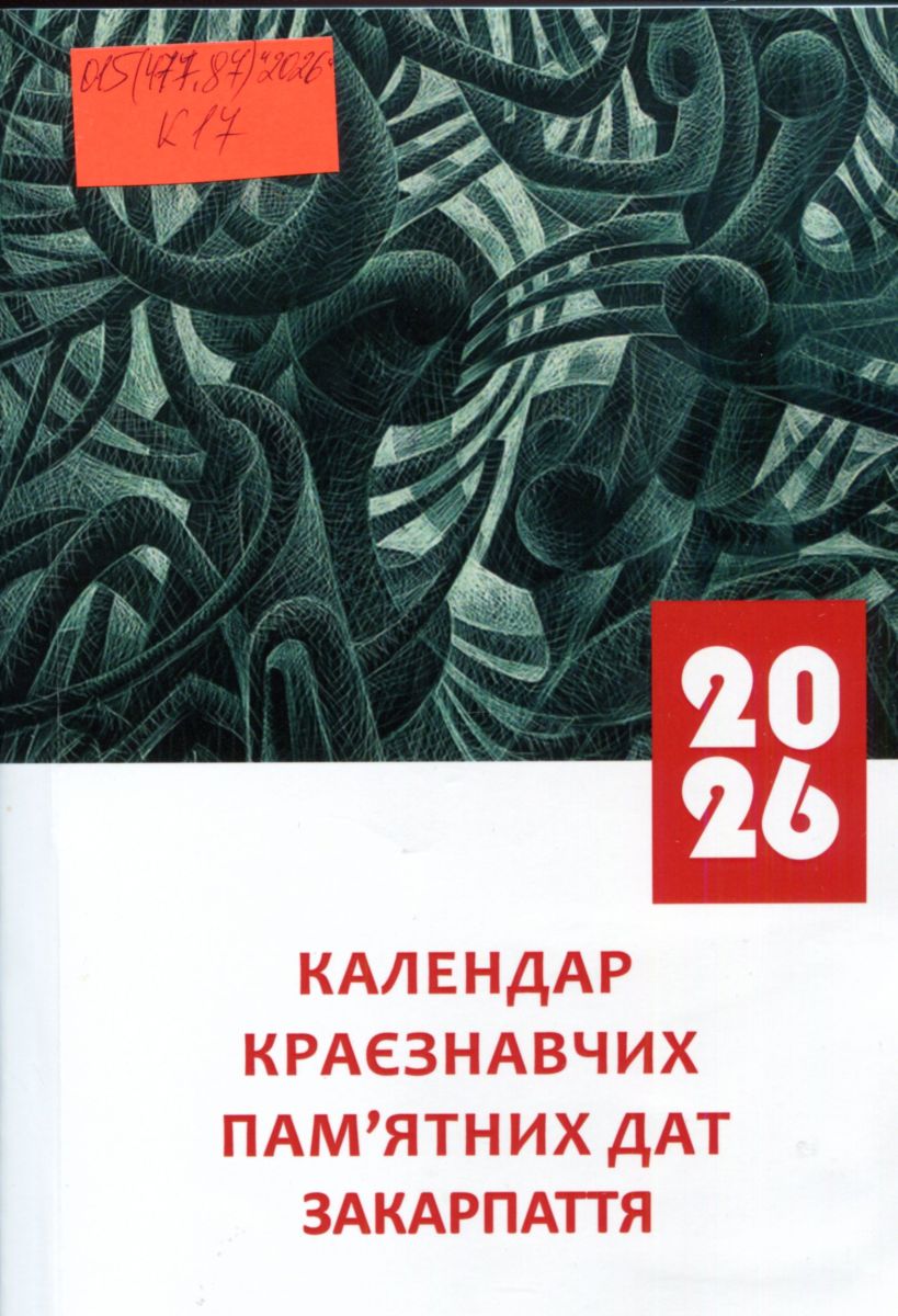 Календар краєзнавчих пам’ятних дат Закарпаття на 2026 рік : рек. бібліогр. посіб. / Департамент культури Закарпат. облдержадмін., КЗ «Закарпат. обл. універс. наук. б-ка ім. Ф. Потушняка» Закарпат. облради ; уклад.: О. О. Шелак, М. Б. Бадида, І. В. Когутич-Гаврош ; за участі Є. Й. Слуцька ; відп. за вип. О. А. Канюка. – Ужгород : РІК-У, 2025. – 406 с. : іл. – Імен. покажч.: с. 396-402.