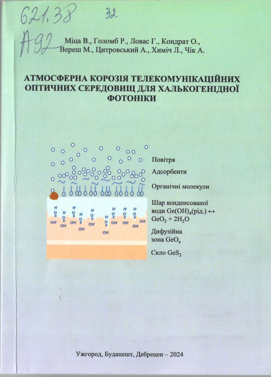 Атмосферна корозія телекомунікаційних оптичних середовищ для халькогенідної фотоніки [Текст] : [монографія] / В. М. Міца, Р. М. Голомб [та ін.]. - Ужгород : ФОП Сабов А. М. ; Дебрецен, 2024. - 128 с.