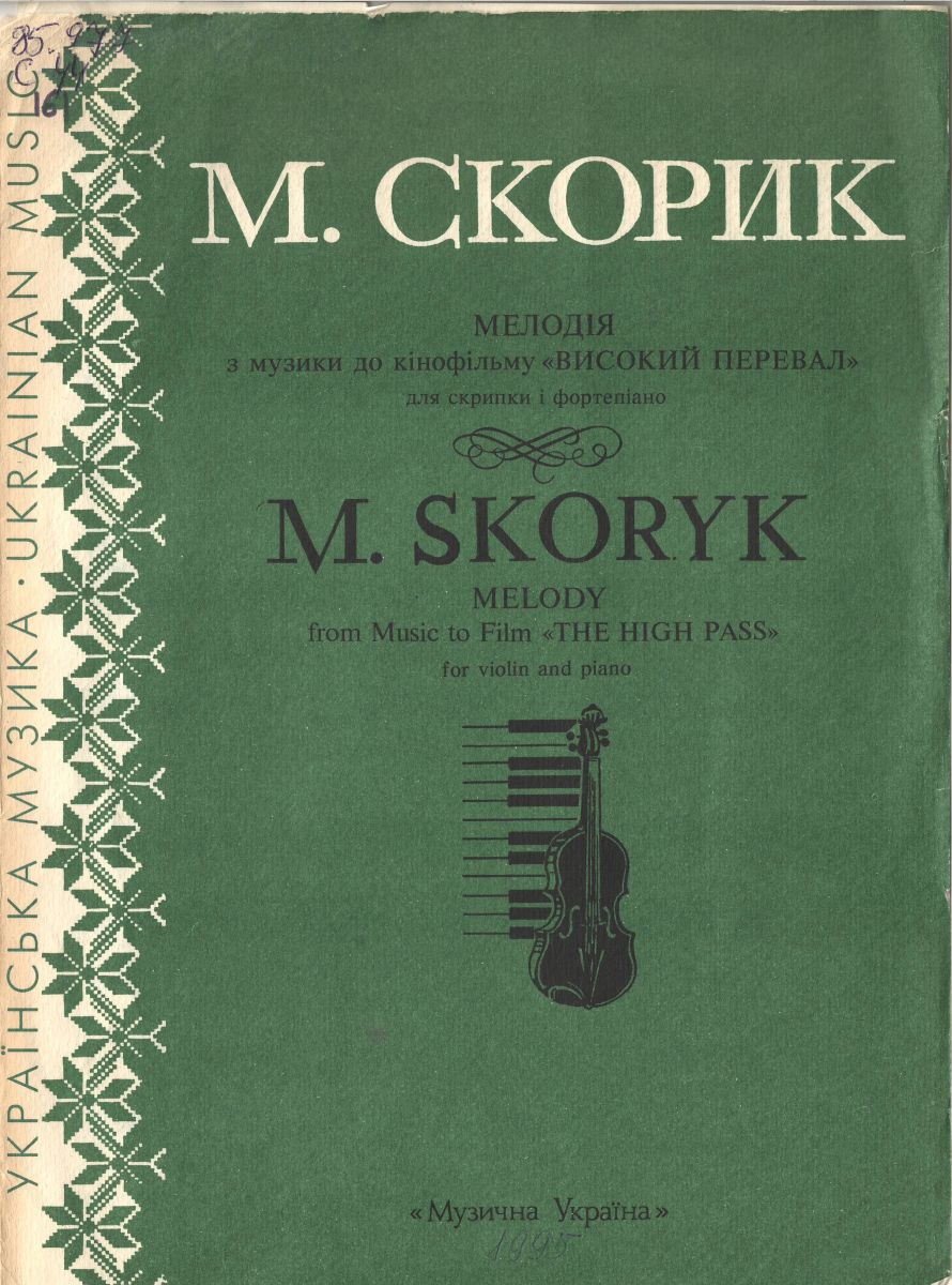 Скорик, Мирослав Михайлович. Мелодія з музики до кінофільму "Високий перевал" [Ноти] : для скрипки і фортепіано = Melody from music to film "The High Pass" : for violo and piano / комп. М. М. Скорик. – К. : Муз. Україна, 1995. – 6 с. : іл. – (Українська музика. Ukrainian music)